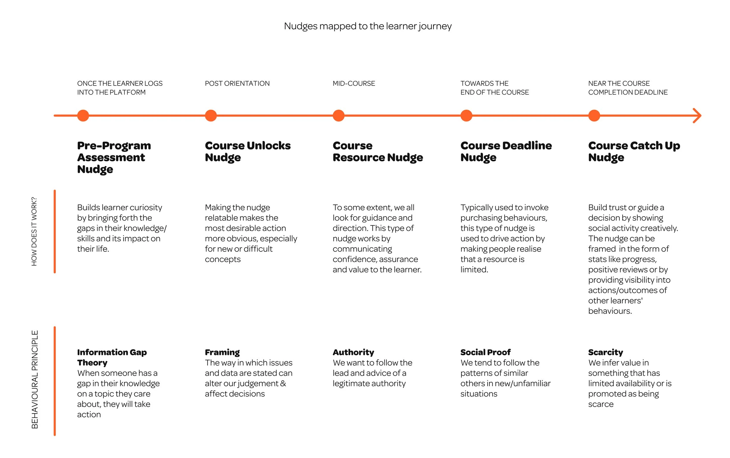 Nudges were reminders to motivate the learners to start and continue learning during the online courses. These were contextualised, rooted in behavioural principles and mapped to different points of the learning journey.