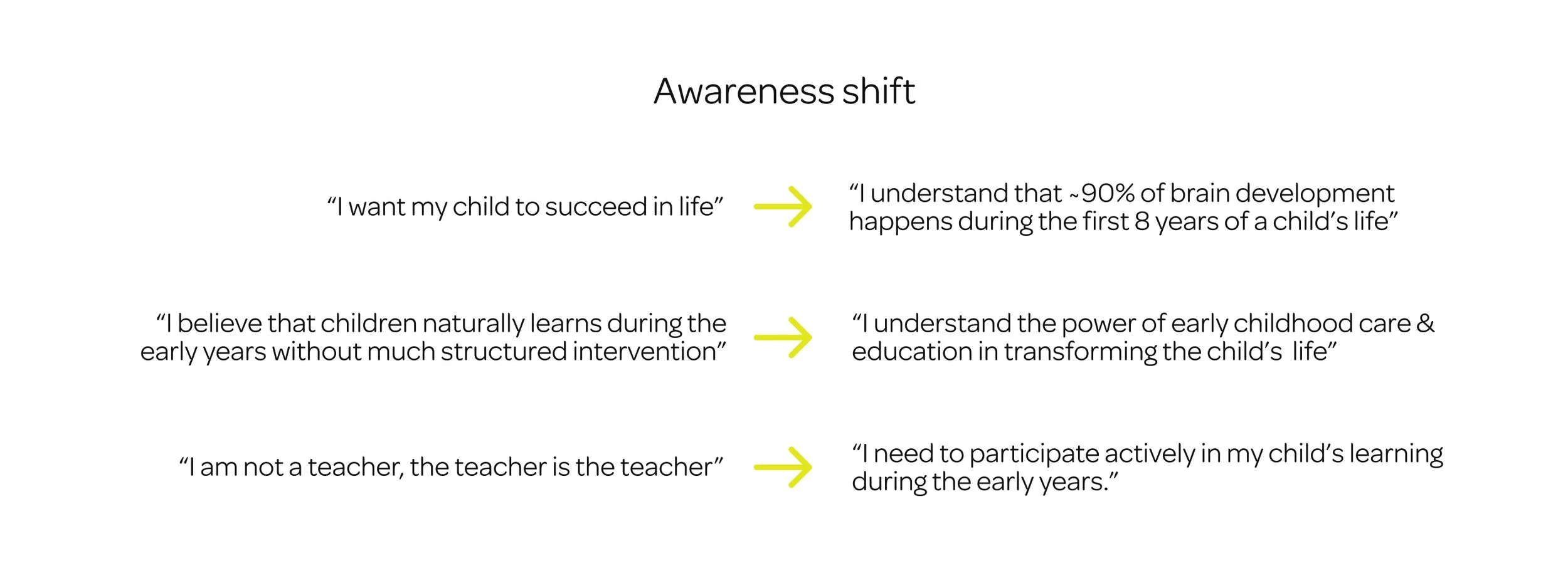 Amid these constraints, most existing parent-focused interventions did not meet parents where they were in several aspects, including aligning with their aspirations, addressing their mistaken beliefs and mindsets, and providing the desired information through the proper delivery mechanisms.